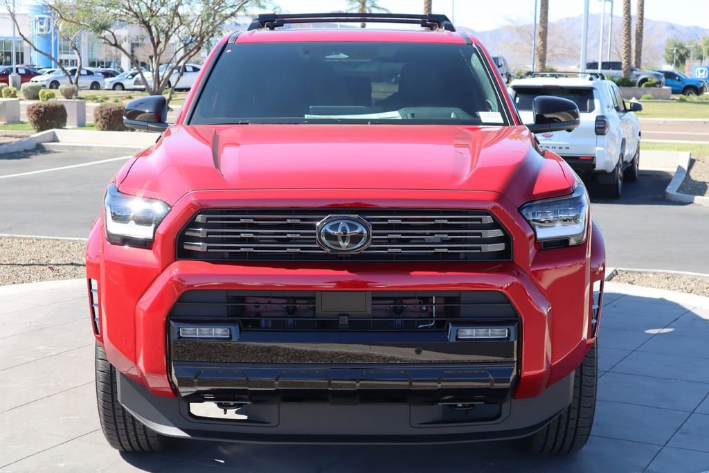 - Dark-chrome tri-bar grille; gloss-black mirror caps and door handles; color-keyed overfenders and rear spoiler; gloss-black "platinum" and "4runner" badges.